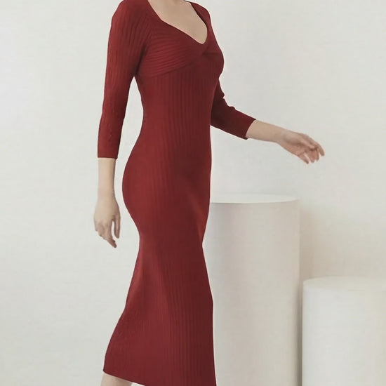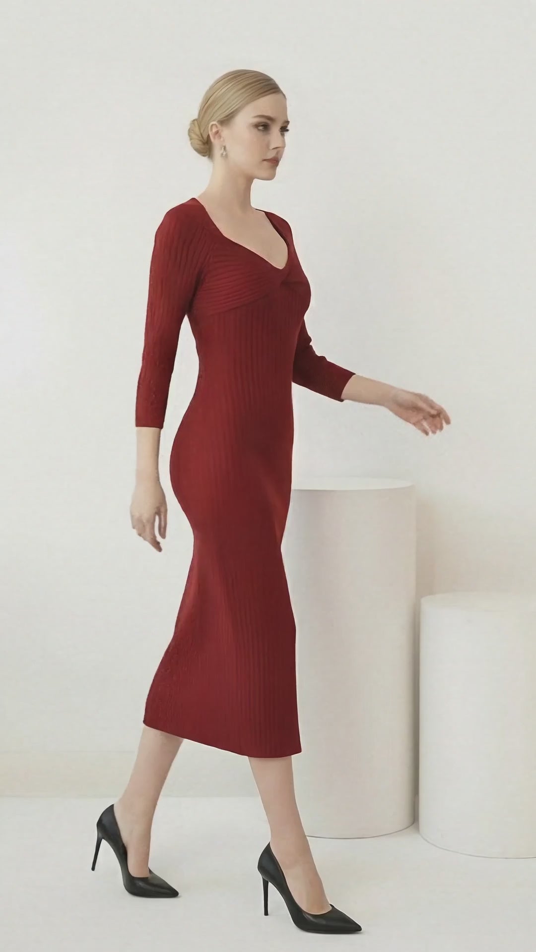 Sleek, feminine, and effortlessly sophisticated — this Twist-Front Ribbed Knit Midi Dress is designed to flatter every curve. The soft ribbed knit fabric offers a comfortable, body-hugging fit that stretches beautifully while maintaining its shape. A chic twist-front neckline adds a touch of detail that enhances the bust and creates a sculpted, elegant silhouette.